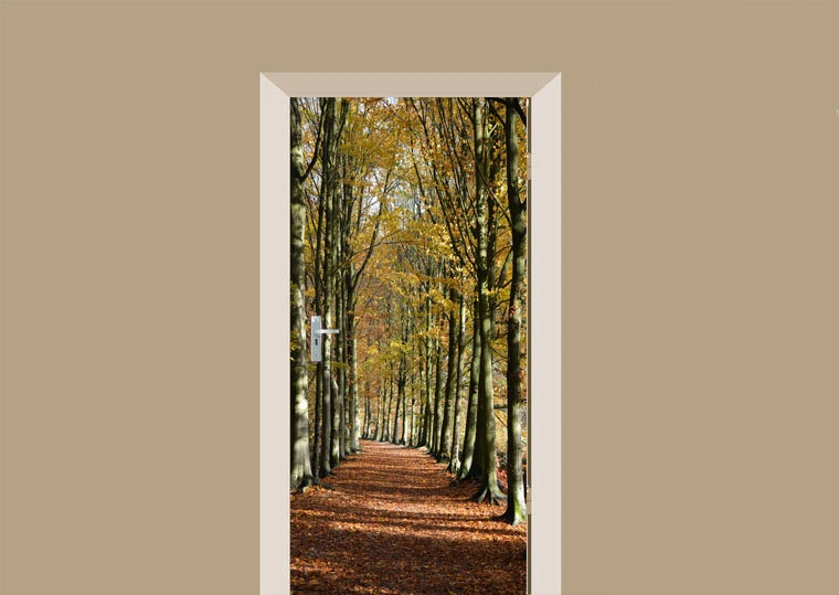 De deursticker bospad straalt typische herfst uit. Op de afbeelding zie je een bospad met aan beide zijden van het pad prachtige bomen met bladeren in echte herfst kleuren. Het pad ligt vol met bruine bladeren die van de bomen af zijn gevallen. Een prachtige afbeelding en een prachtige deurposter!