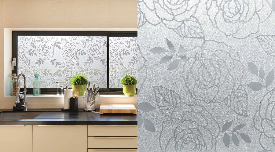 Folie met de print van rozen. Perfecte raamdecoratie en goed privacyfolie! Het raamfolie met plaklaag plakt eenvoudig op gladde en vetvrije ramen en glazen. Het glasfolie schermt af, maar laat wel licht door. Het raamfolie heeft een breedte van 45cm. De lengte mag je zelf kiezen.