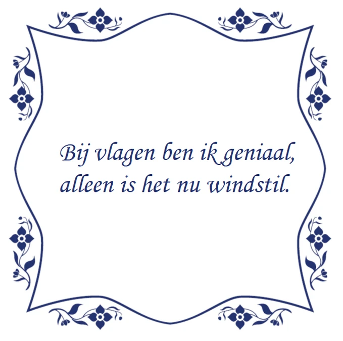 Deze tegelsticker bevat de tekst: “Bij vlagen ben ik geniaal, alleen is het nu windstil.”